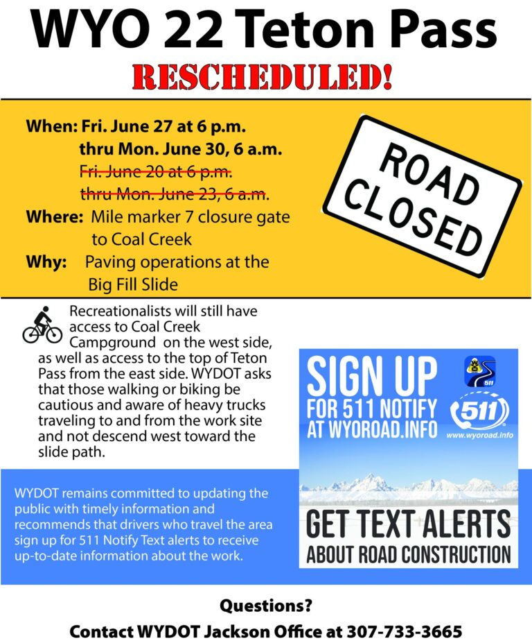 The Wyoming Department of Transportation (WYDOT) announced Tuesday that the three-day closure of Teton Pass originally scheduled for this weekend has been rescheduled to the weekend of June 28 due to “weather delays and scheduling conflicts.” 🚧 Heads up, Jackson and Idaho…