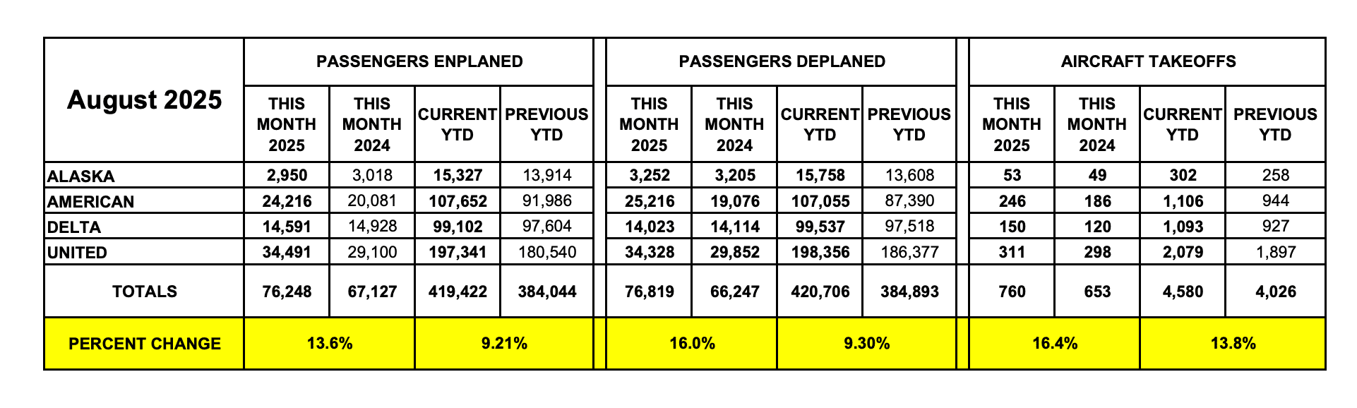 - Passengers Enplaned (departing): 76,248 โ up 13.6% year-over-year