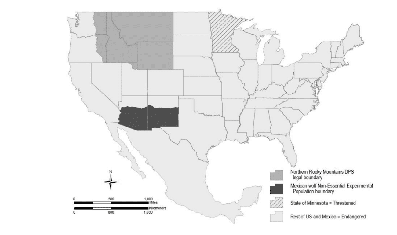 THE 44 STATES ARE ALL OR PORTIONS OF THOSE STATES IN THE COTERMINOUS US OUTSIDE OF THE NORTHERN ROCKIES, WHERE WOLVES HAVE LONG SINCE BEEN FEDERALLY DELISTED, AND SOUTHERN PORTIONS OF ARIZONA AND NEW MEXICO, WHICH ARE HOME TO MEXICAN WOLVES. (USFWS)
