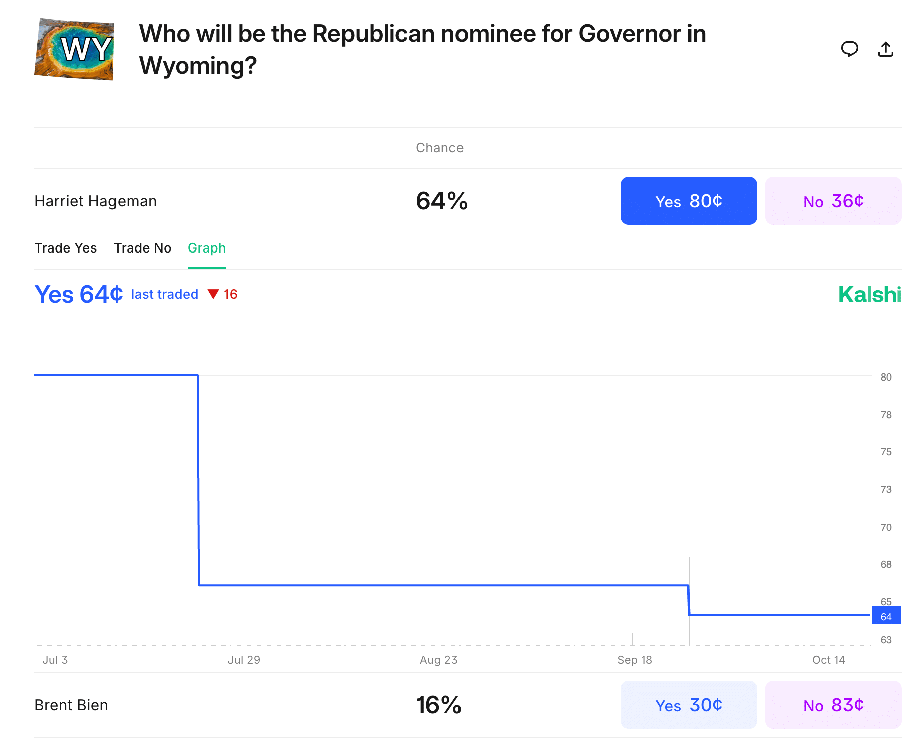 Current frontrunner Harriet Hageman, Wyoming’s lone U.S. Representative and a close ally of President Trump, still holds a 64% chance to win the GOP nomination for governor.