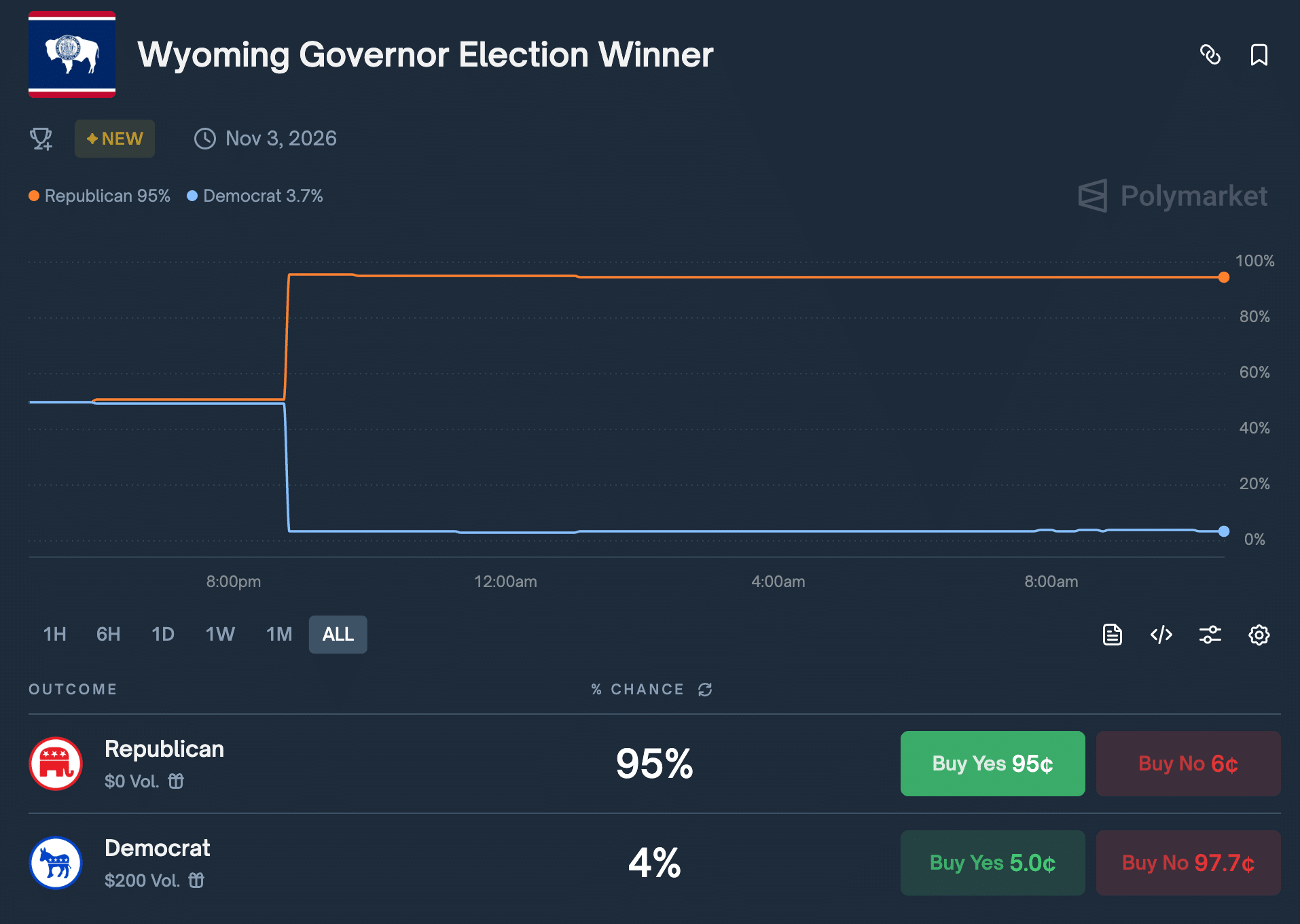 According to Polymarket, traders now give Republicans a 95% chance of retaining the governor’s mansion in Cheyenne, with Democrats languishing at just 4%.