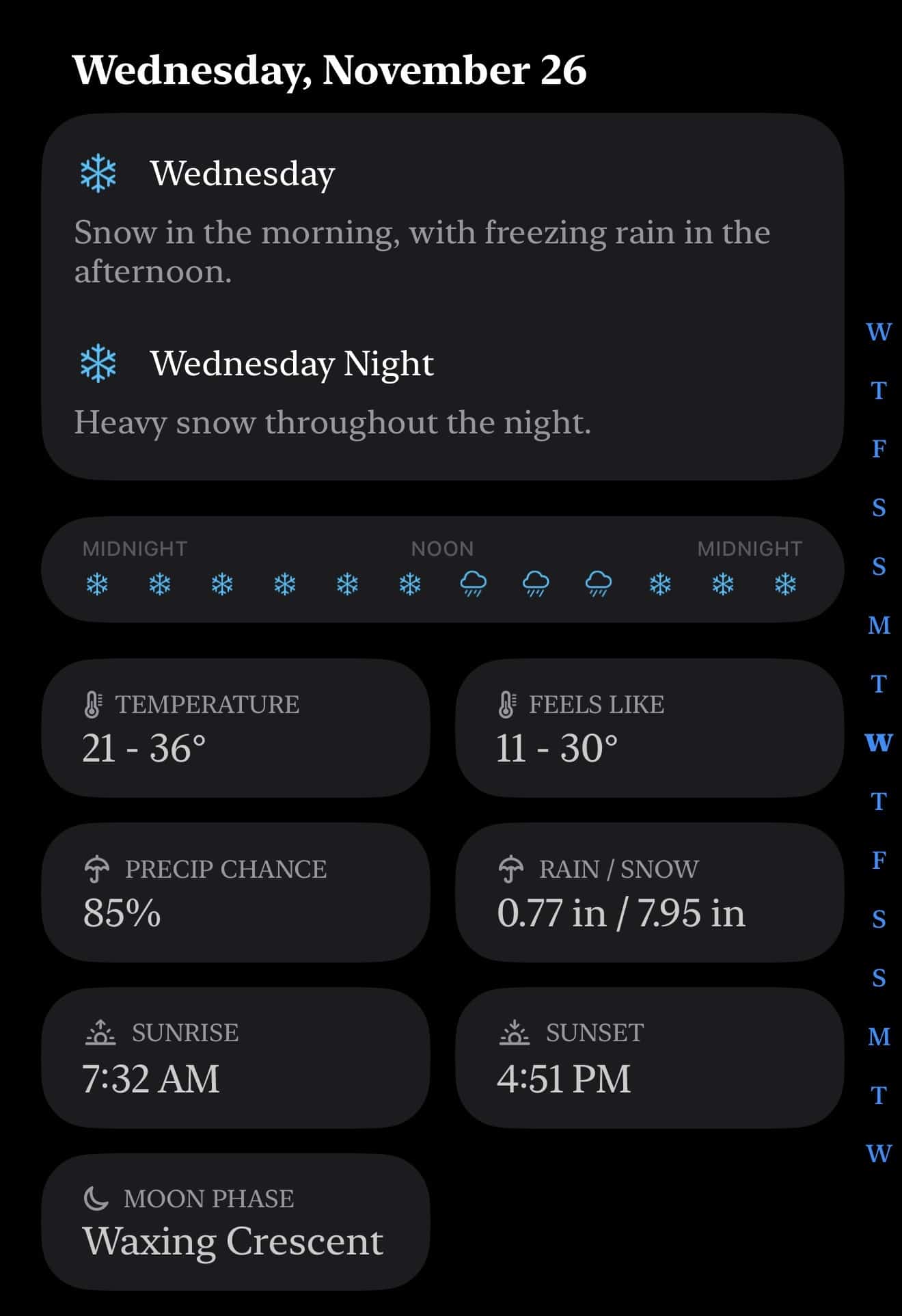 Precip chances aren’t overwhelmingly high yet (Carrot is calling ~29%), but the structure of the storm is the important part: A colder trough dropping in right as Thanksgiving week starts.
